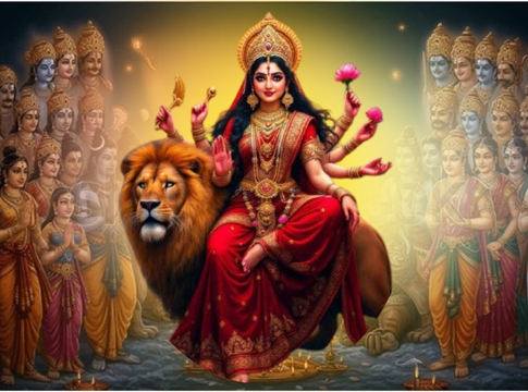 तेजपुंज से प्रकट हुईं शेर पर सवार देवी